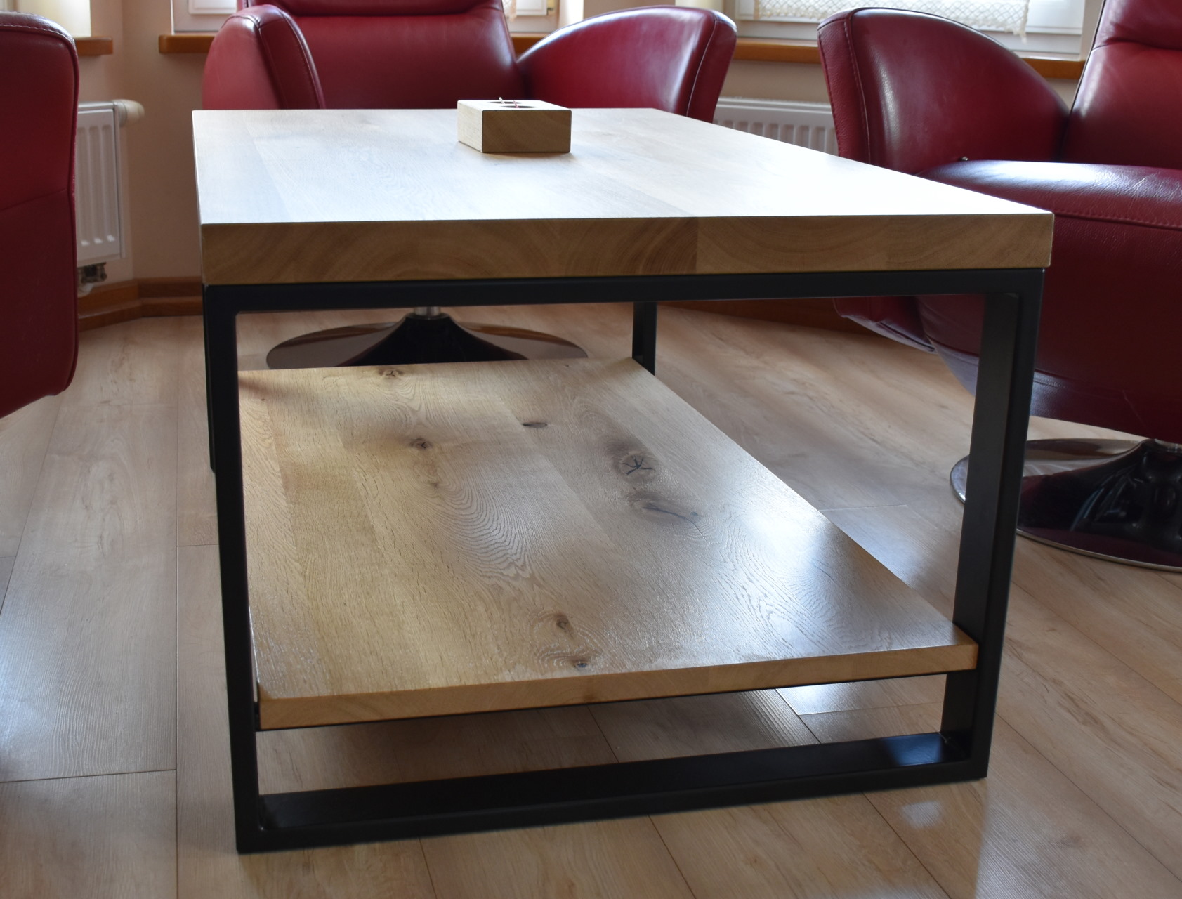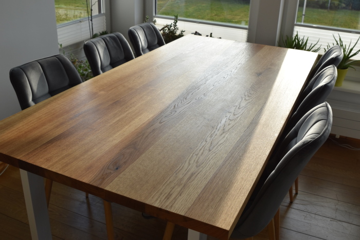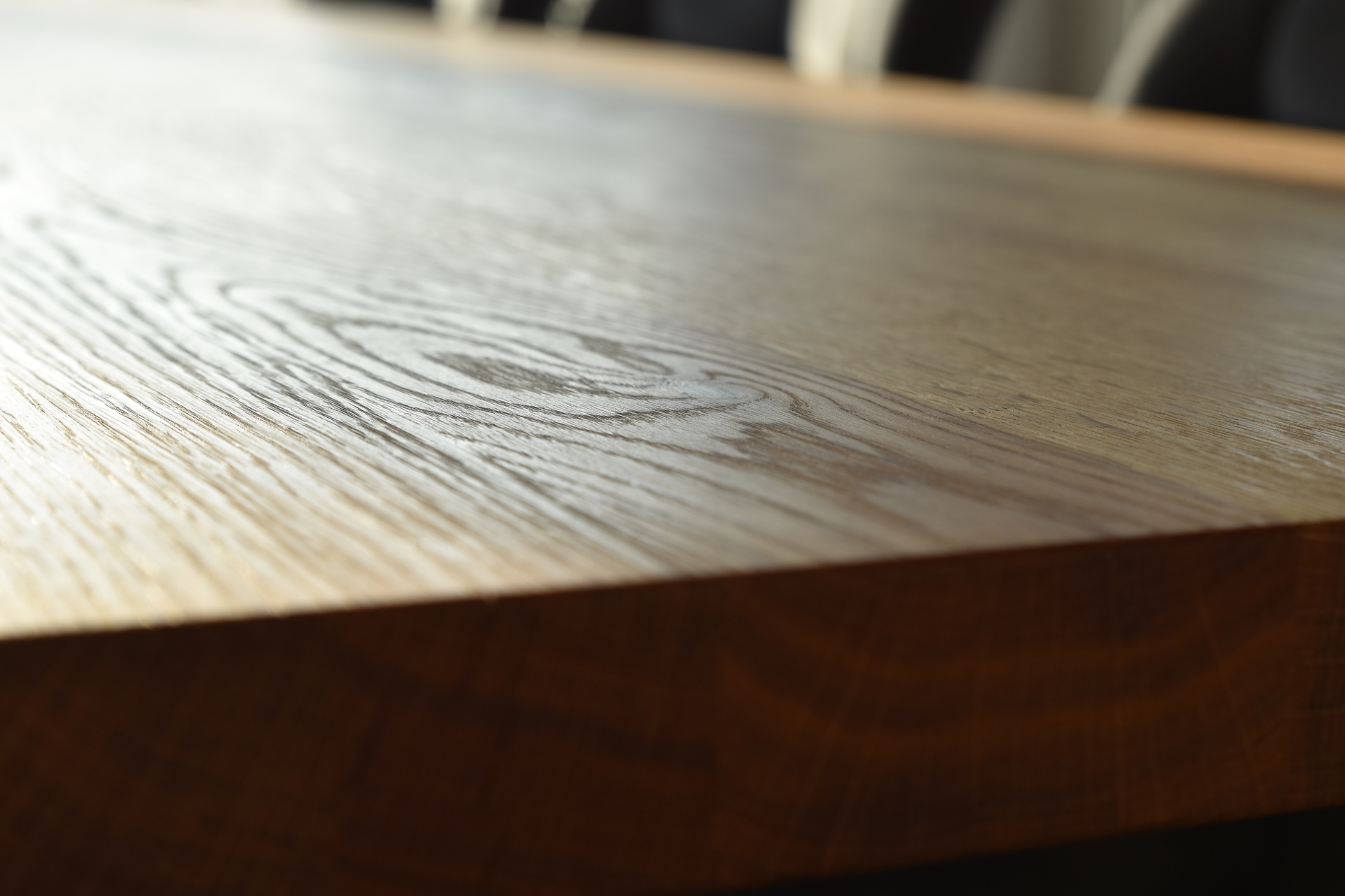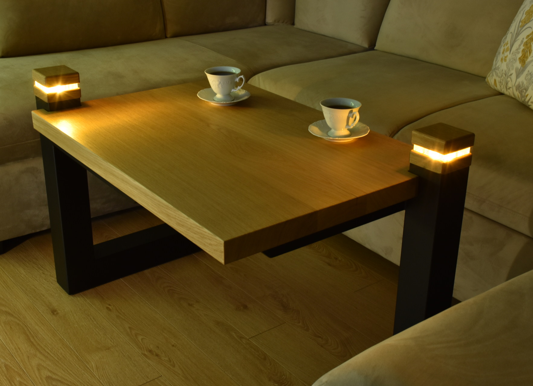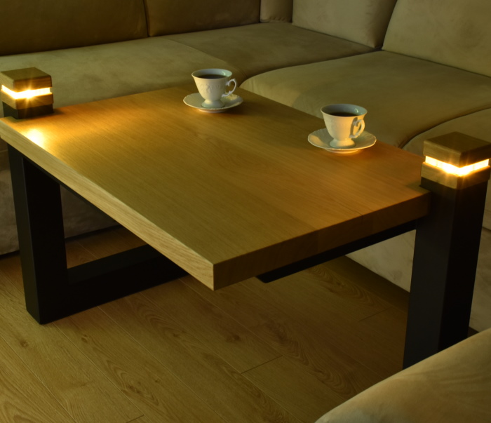 Tworzymy niepowtarzalne stoły i stoliki z blatami z drewna naturalnego, np. dębiny, z nogami wykonanymi z profili stalowych malowanych proszkowo.